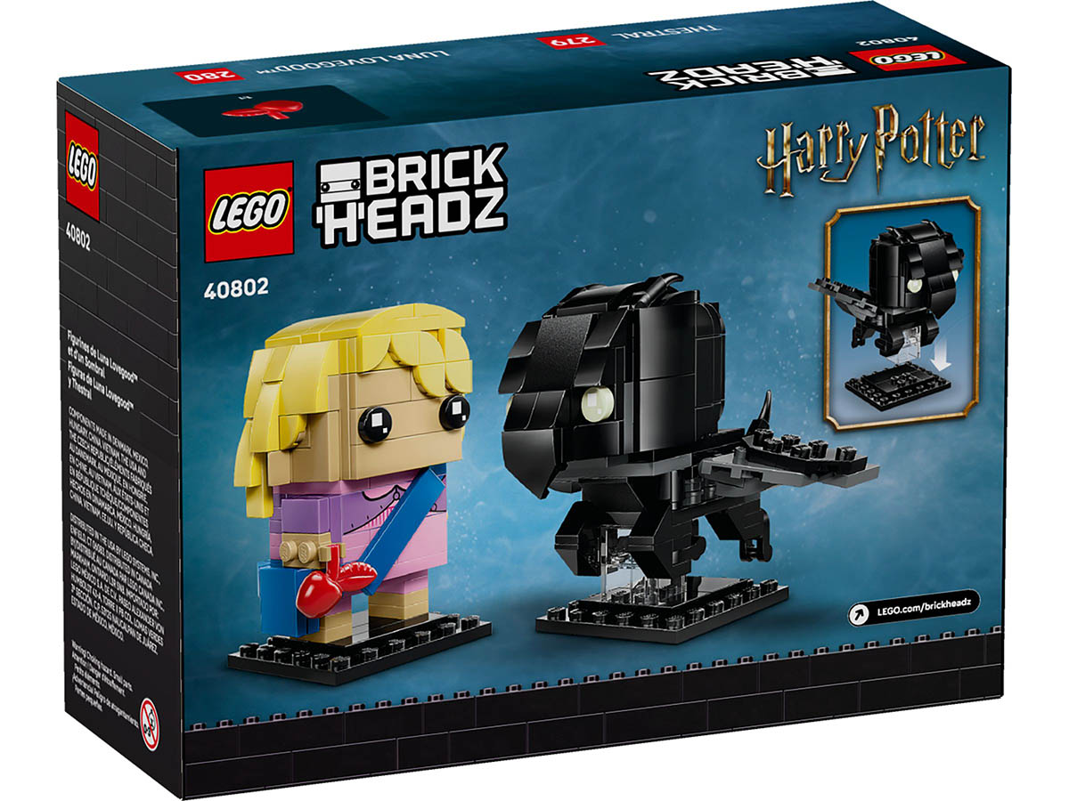 Luna trägt ihr farbenfrohes Outfit, ihre charakteristische Frisur und hält – ganz „Luna“ – einen Apfel in der Hand. Der Thestral erscheint in eleganter BrickHeadz Silhouette mit markanten Flügeln und fein angedeuteter Knochenstruktur. Die klare Linienführung der BrickHeadz macht beide Modelle zu echten Blickfängen, die sofort Erinnerungen an Hogwarts™ und verborgene Pfade wecken.