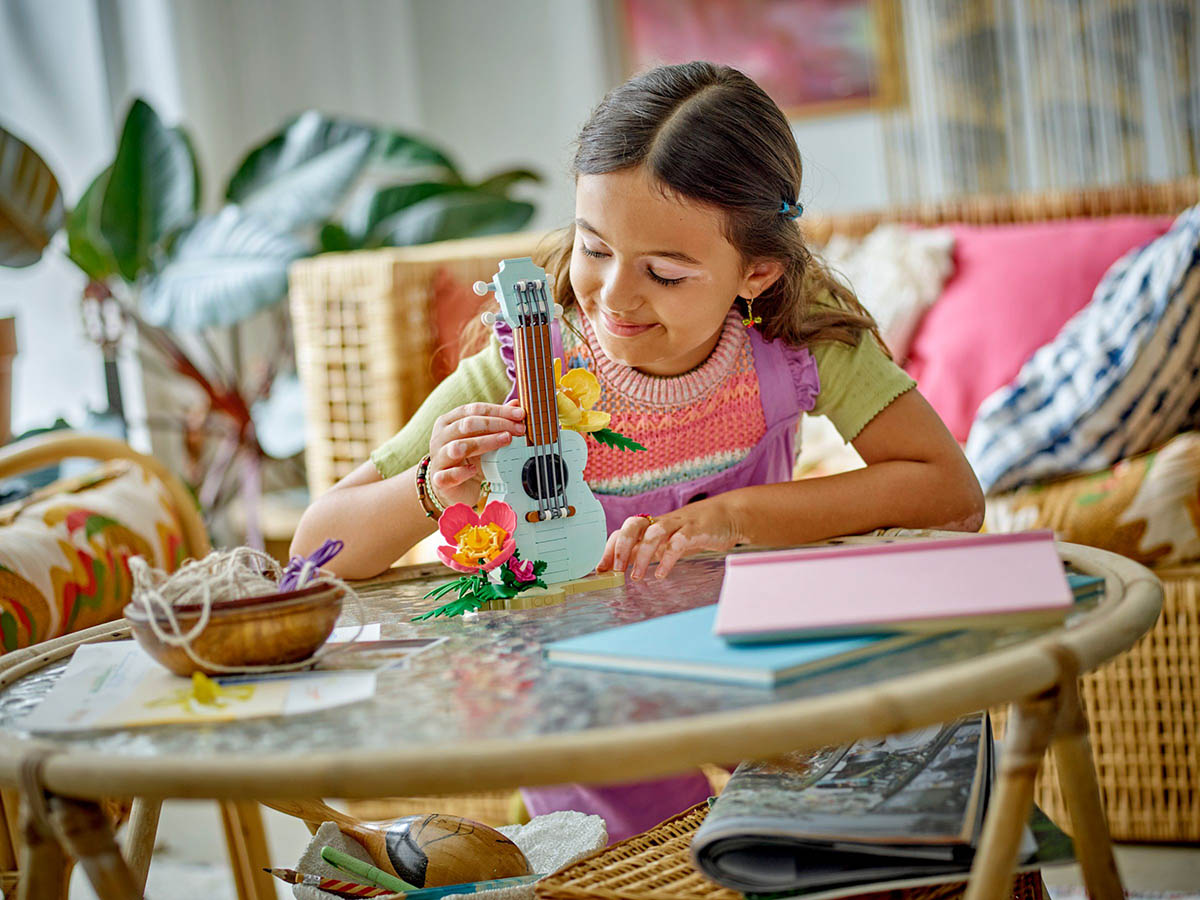 Erlebe mit diesem 3-in-1-Set die Freude am Bauen, Spielen und Ausstellen. Baue zunächst eine Ukulele mit einer bezaubernden Strandkulisse.